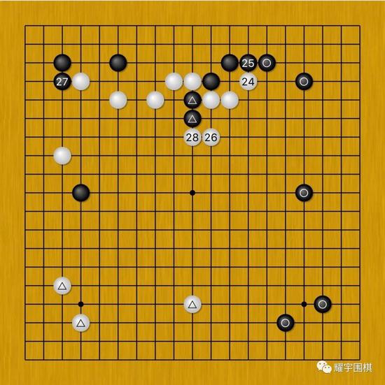 这番转换,从实地的角度来说,黑棋的收获要比白棋大,但从全局的角度来看,白26,28两手棋具有重要的战略价值!一是让黑右边圆圈阵势黯然失色;二是让自身左下三颗白三角子组成的阵势蓬荜生辉!