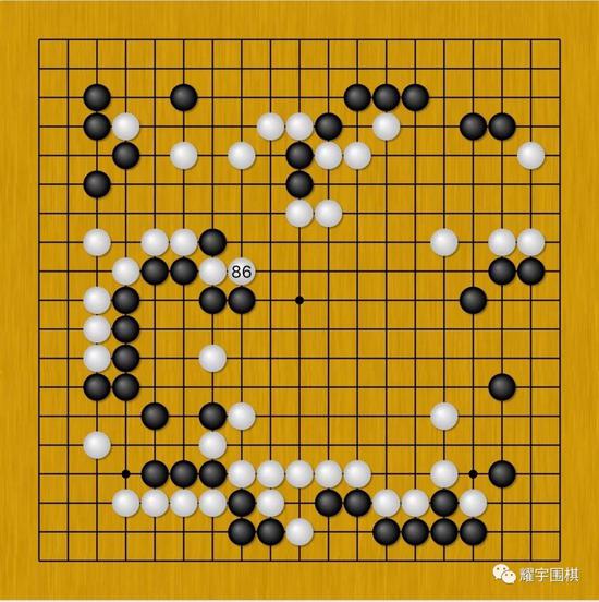 图10:这是数手之后的局面,现在白棋正在利用全局的厚味攻击黑左边大块,白86跑出的时候,李昌镐下出了本局的败着: