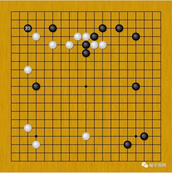 图1:我执白,李昌镐黑23点角,正常来说,白棋会在角上跟着应,但我当时的下法很有意思: