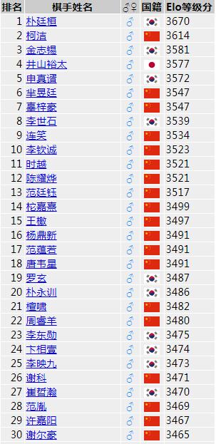 Goratings更新了截至4月8日的世界围棋等级分,韩国棋手朴廷桓九段以3670分继续领跑,柯洁为3614分较上周上升6分,暂列第二位,目前朴廷桓领先柯洁达到56分,较上周分差拉近5分。