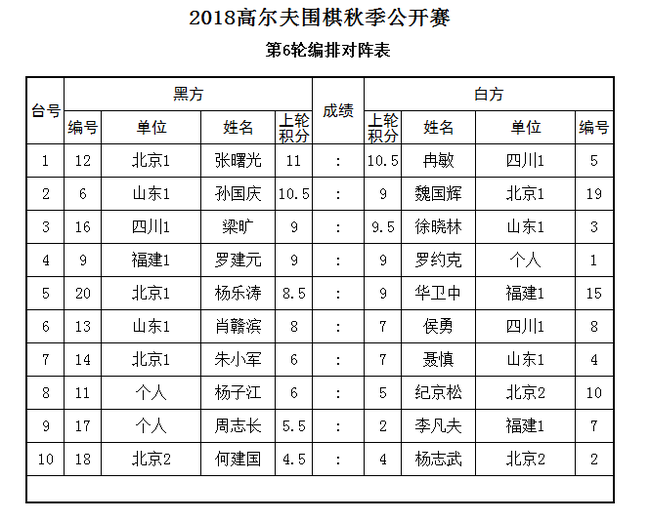 五轮比赛战罢,北京队张曙光积11分,暂时领跑,山东队孙国庆、四川队冉敏10.5分紧随其后。鹿死谁手,需听下回分解。第六轮对阵情况如下: